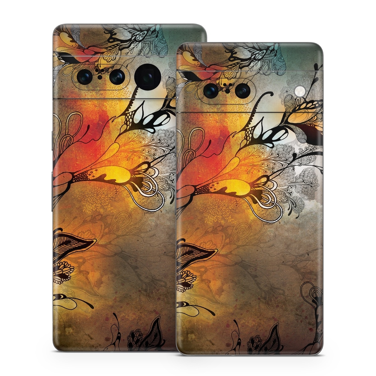 iStyles Google Pixel 7 Series Skin design of Yellow, Orange, Art, Branch, Leaf, Graphic design, Visual arts, Pattern, Design, Modern art, with black, red, orange, yellow colors, and tagged with abstract.