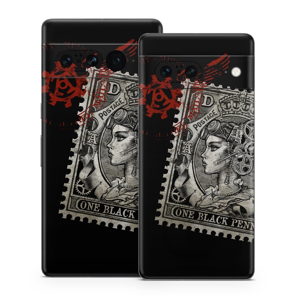 iStyles Google Pixel 7 Series Skin design of Font, Postage stamp, Illustration, Drawing, Art, with black, gray, red colors, and tagged with people, objects, signs.
