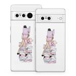 iStyles Google Pixel 7 Series Skin design of Gesture, Art, Cartoon, Font, Drawing, Illustration, Painting, Fictional character, Animation, Diagram, with black, white, pink, purple, blue, yellow, brown colors, and tagged with signs, objects, people, books, girl, pink, purple, reading.