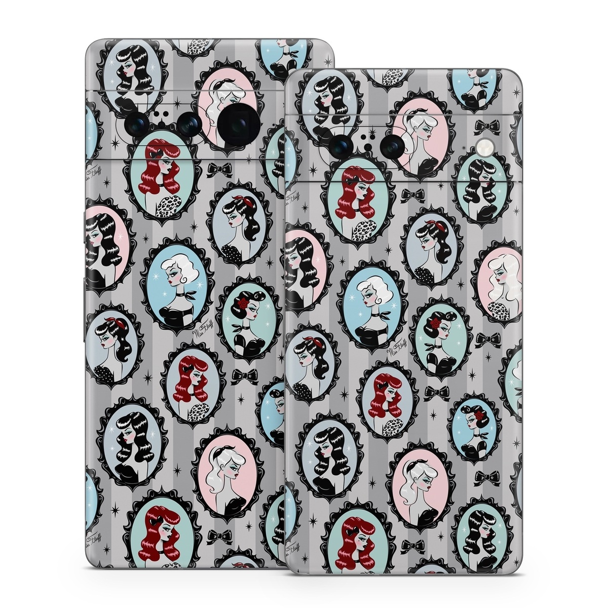 iStyles Google Pixel 7 Series Skin design of Pattern, Design, Textile, Visual arts, Circle, Art, with black, blue, gray, yellow, red, pink colors, and tagged with patterns, people, objects, bows, cameo, dolls, pinup.