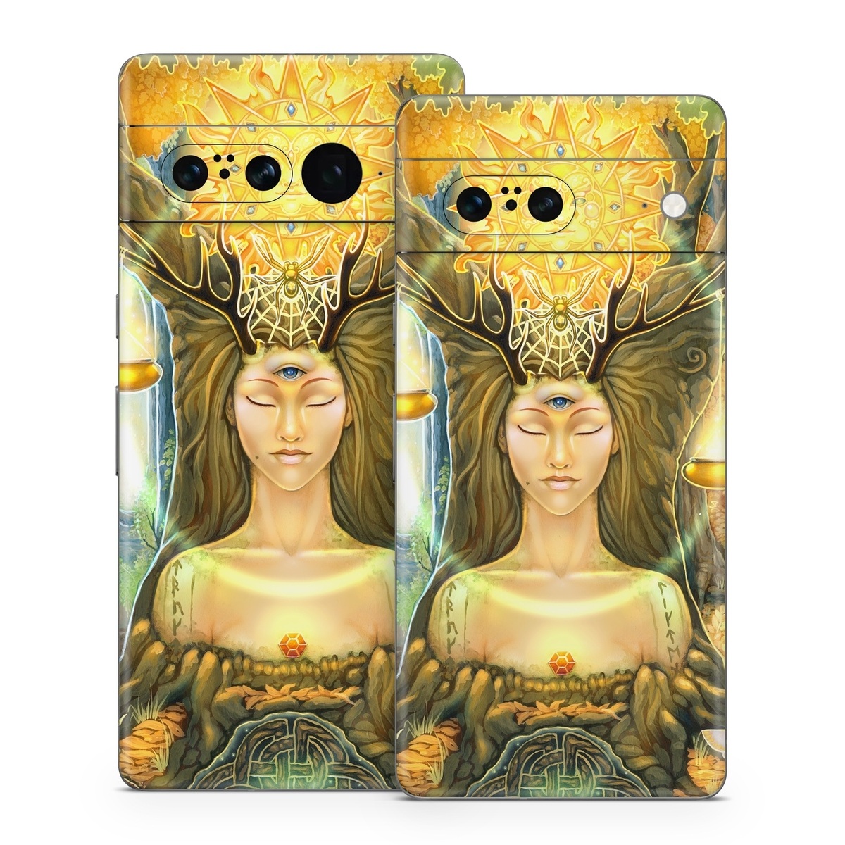 iStyles Google Pixel 7 Series Skin design of Painting, Art, Illustration, Plant, Fictional character, Mythology, Cg artwork, Visual arts, Glass, Drawing, with yellow, green, brown, pink, orange, black colors, and tagged with fantasy, people, signs, animals, nature, objects, flames, sun, woman, trees, symbols.
