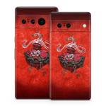 iStyles Google Pixel 7 Series Skin design of Orange, Art, Font, Sleeve, Tints and shades, Symbol, Pattern, Logo, Magenta, Graphics, with black, red, white, gray colors, and tagged with skulls, hearts, flowers, objects, forever, together.