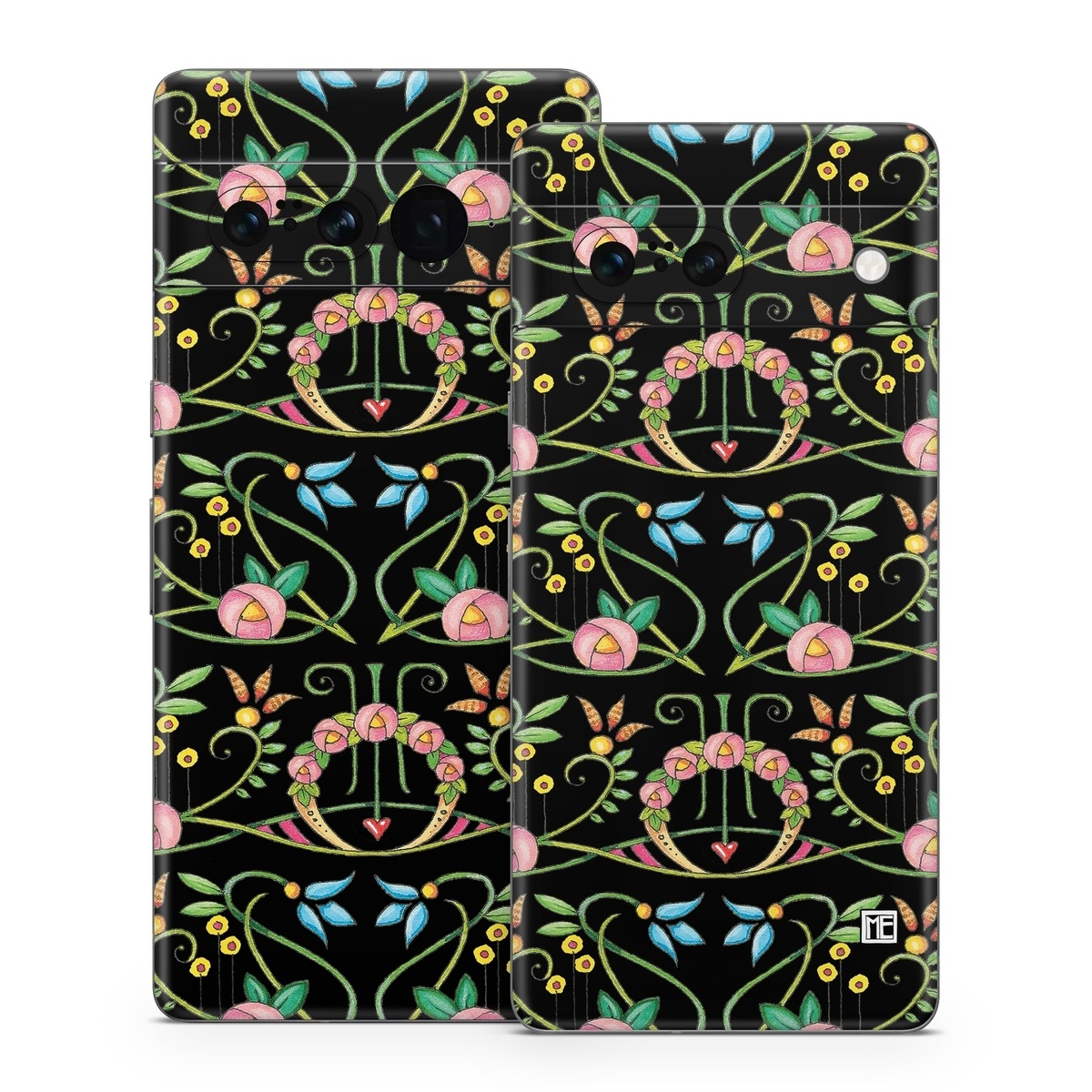 iStyles Google Pixel 7 Series Skin design of Flower, Rectangle, Textile, Ornament, Plant, Line, Motif, Creative arts, Art, Pattern, with black, pink, blue, green, yellow colors, and tagged with patterns, flowers, flower, arc, pattern.