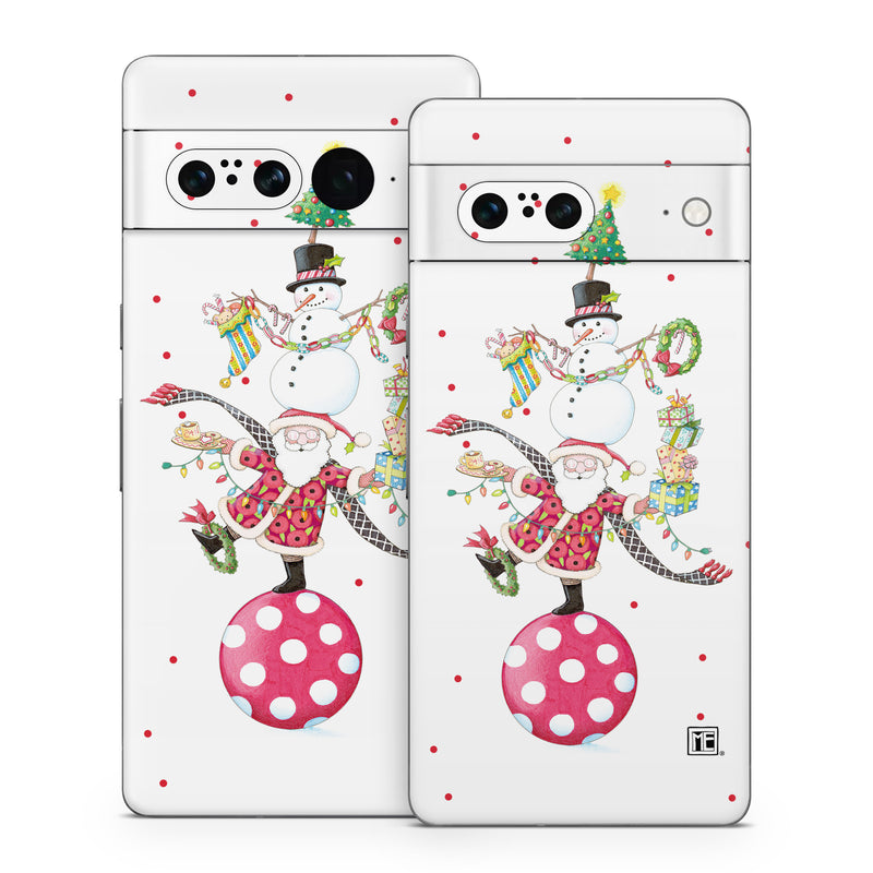 iStyles Google Pixel 7 Series Skin design of Snowman, Holiday ornament, Christmas ornament, Creative arts, Christmas decoration, Ornament, Pattern, Event, Art, Circle, with white, red, yellow, green, orange, black, blue colors, and tagged with people, fantasy, patterns, objects, santa, claus, snowman, presents, christmas, tree, ball, stocking, multitask.