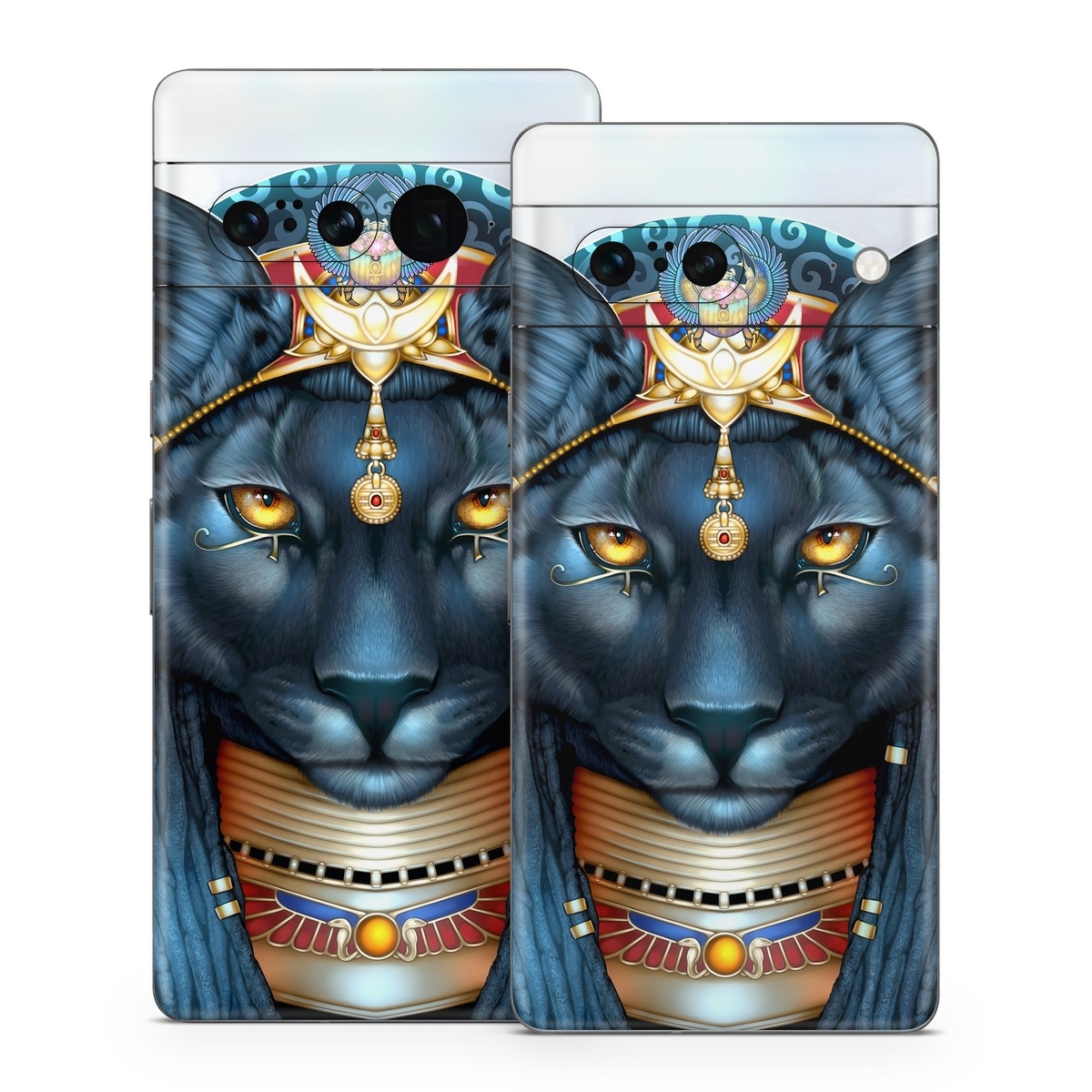 iStyles Google Pixel 7 Series Skin design of Jaw, Font, Whiskers, Toy, Snout, Personal protective equipment, Fictional character, Electric blue, Graphics, Mask, with black, white, red, blue, yellow, orange colors, and tagged with fantasy, animals, signs, space, objects, panther, egyptian, moon.