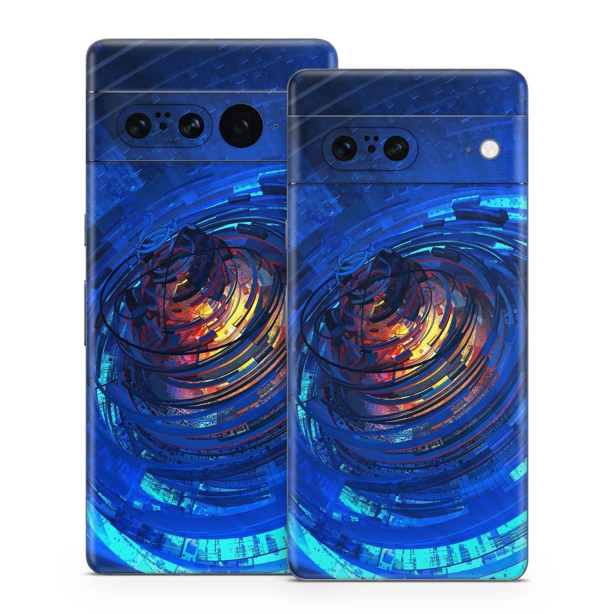 iStyles Google Pixel 7 Series Skin design of Blue, Water, Circle, Vortex, Electric blue, Wave, Liquid, Graphics, Pattern, Colorfulness, with blue, orange, yellow colors, and tagged with abstract.