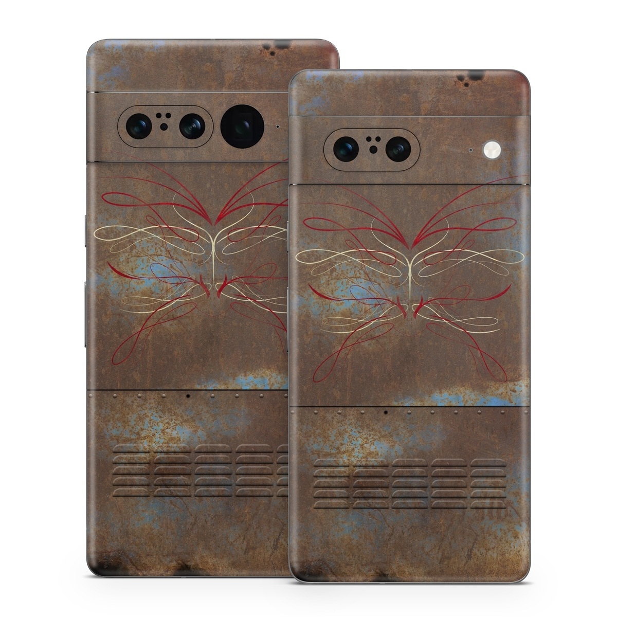 iStyles Google Pixel 7 Series Skin design of Line, Visual arts, Symmetry, Concrete, Tints and shades, Painting, Art, with blue, red, yellow, brown, black colors, and tagged with signs, lookslike, objects, patterns, hotrod, musclecar, ratrod, retro, rust.