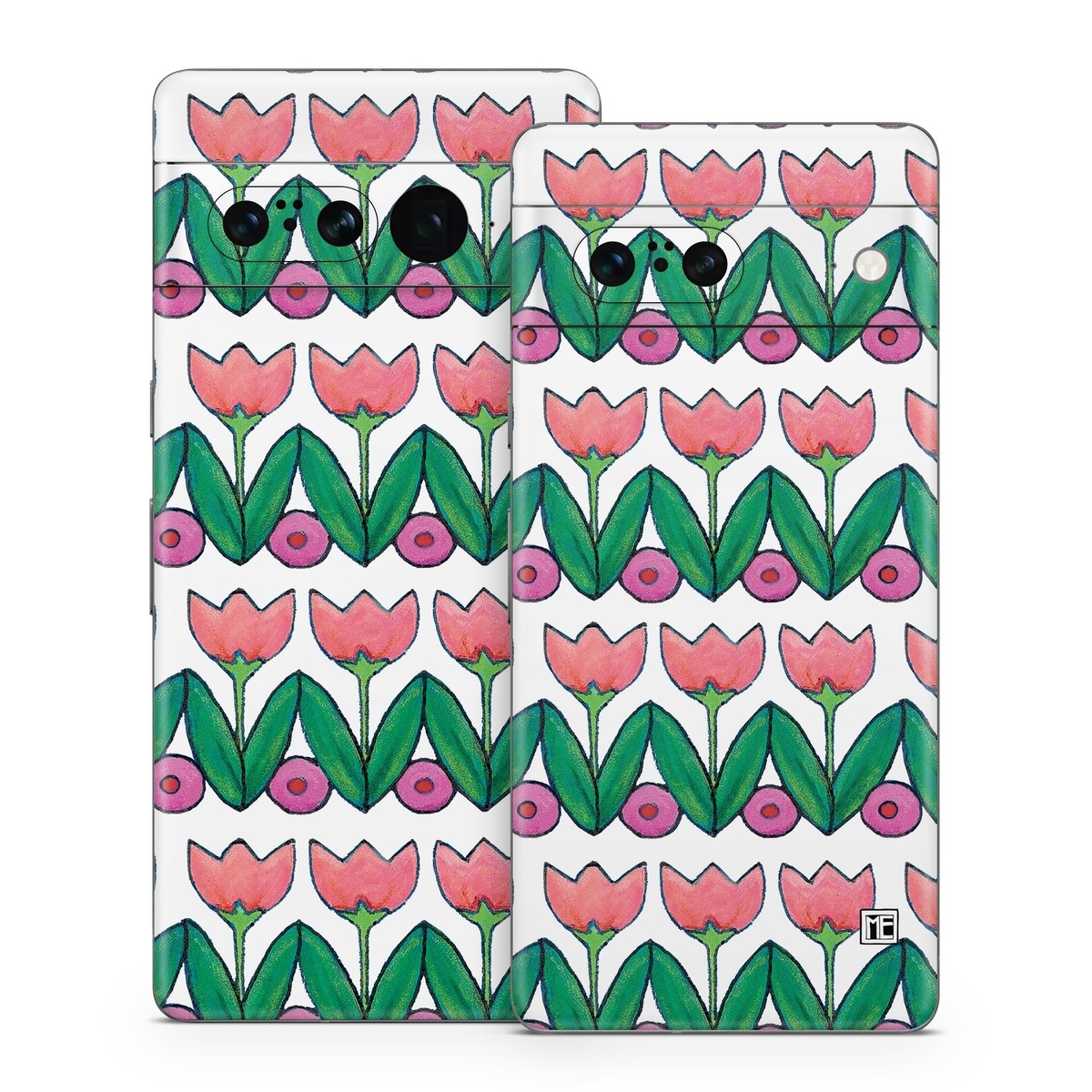 iStyles Google Pixel 7 Series Skin design of Green, Rectangle, Textile, Botany, Line, Symmetry, Art, Font, Pattern, Magenta, with white, green, pink, purple colors, and tagged with patterns, flowers, tulip, drawing, repetative.