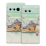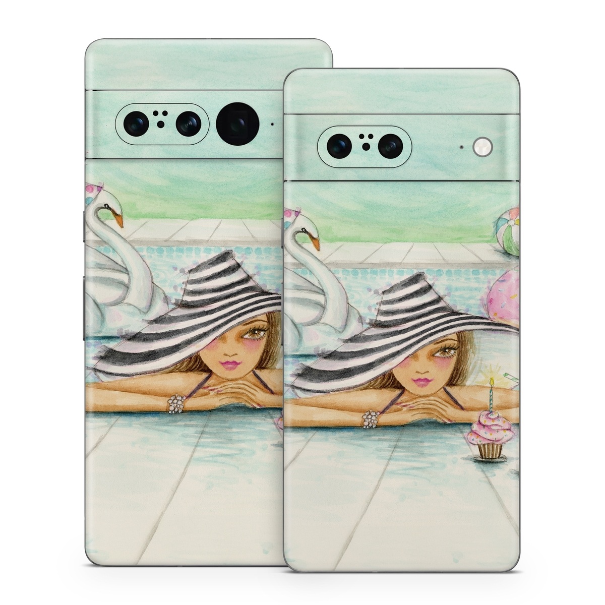 iStyles Google Pixel 7 Series Skin design of Watercolor paint, Illustration, Cartoon, Art, Painting, Drawing, Fictional character, with blue, pink, white, black, brown, red, green, yellow colors, and tagged with people, fineart, objects, animals, urban, drawn, face, faces, fashion, handdrawn, painting, portrait, woman, women, donut, present, cocktail, drink, swan, swimming, ball, cupcake.