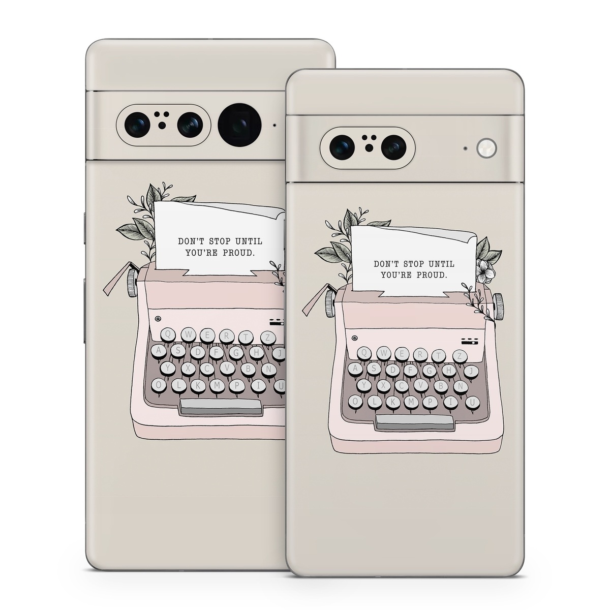 iStyles Google Pixel 7 Series Skin design of Typewriter, Office equipment, Space bar, Office supplies, Illustration, with black, white, pink colors, and tagged with objects, flowers, filigree, flower, flowers, pastel, sketch.