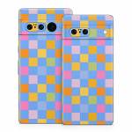 iStyles Google Pixel 7 Series Skin design of Rectangle, Azure, Textile, Orange, Aqua, Font, Symmetry, Magenta, Tints and shades, Parallel, with blue, yellow, orange, green, pink colors, and tagged with patterns, checkered, squares, colorful.