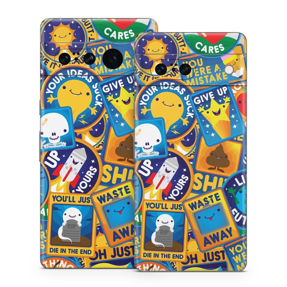 iStyles Google Pixel 7 Series Skin design of Pattern, Visual arts, Design, Art, Mosaic, Psychedelic art, with blue, yellow, orange, white, green, red, gray colors, and tagged with patterns, signs, space, objects, hearts, fuck, funny, humor.