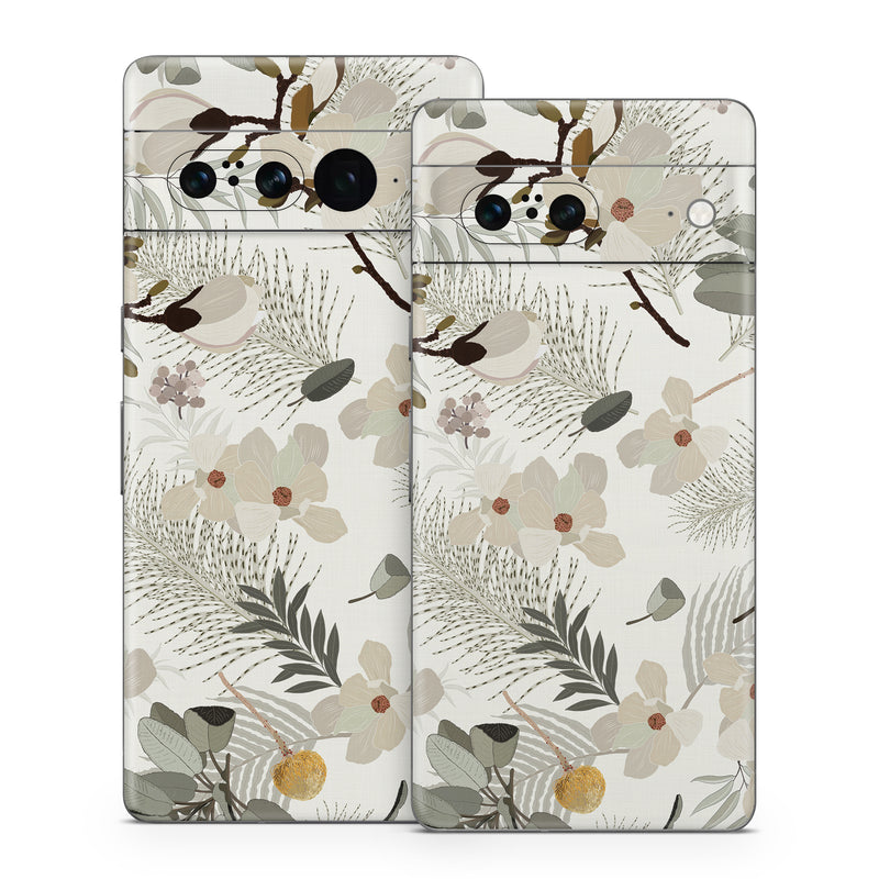 iStyles Google Pixel 7 Series Skin design of Branch, Botany, Twig, Plant, Textile, Organism, Art, Creative arts, Pattern, Tints and shades, with white, green, yellow, brown, gray colors, and tagged with patterns, flowers, nature, flowers, leaves.