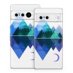 iStyles Google Pixel 7 Series Skin design of Blue, Cobalt blue, Azure, Pattern, Logo, Design, Electric blue, Graphics, Illustration, Triangle, with white, blue, purple, green colors, and tagged with nature, objects, signs, earth, geometry, moon, mountains, nature, plants, trees.