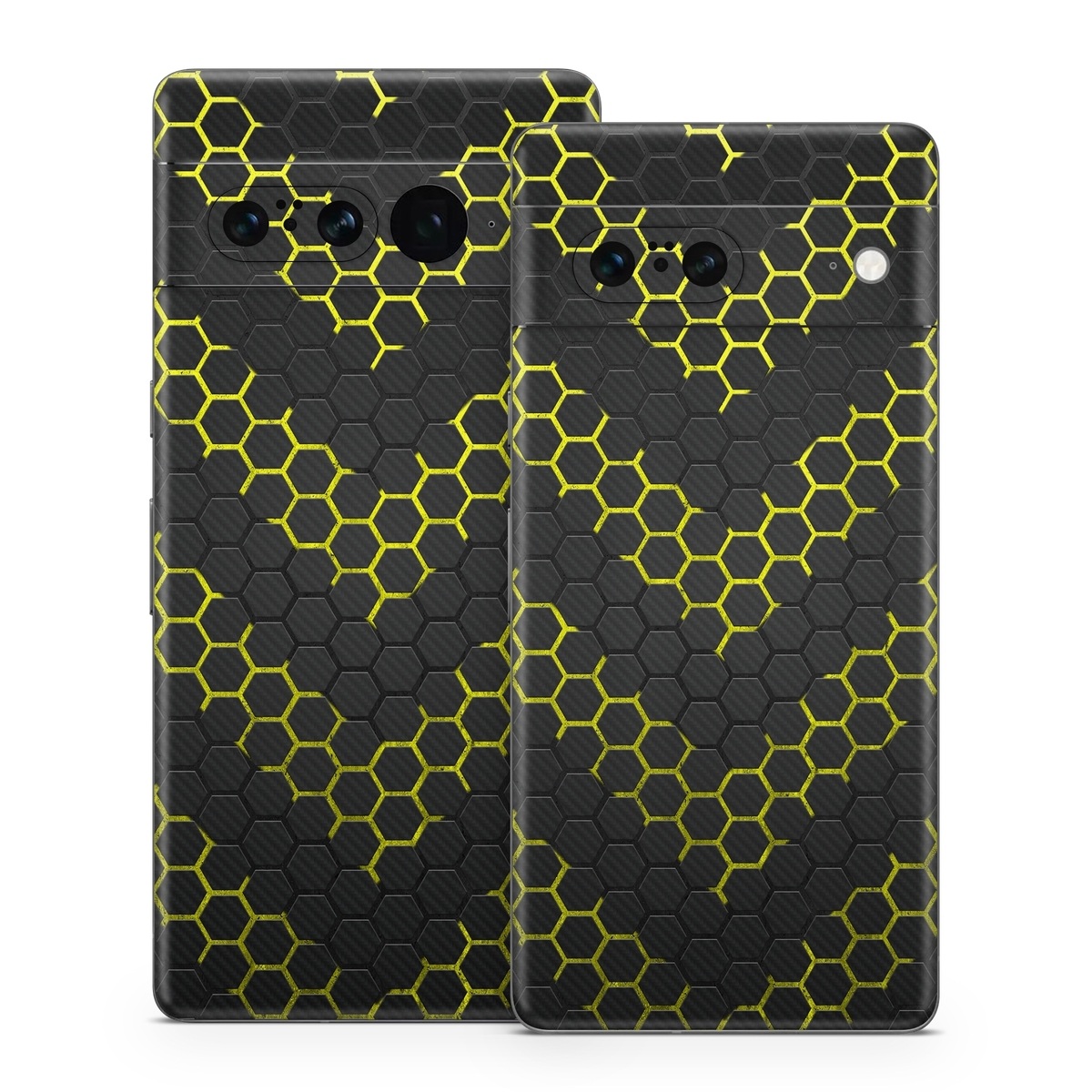 iStyles Google Pixel 7 Series Skin design of Black, Pattern, Yellow, Mesh, Net, Chain-link fencing, Design, Metal, with black, gray, yellow colors, and tagged with lookslike, space, fantasy, animals, drones, geometric, hexagon, tech.