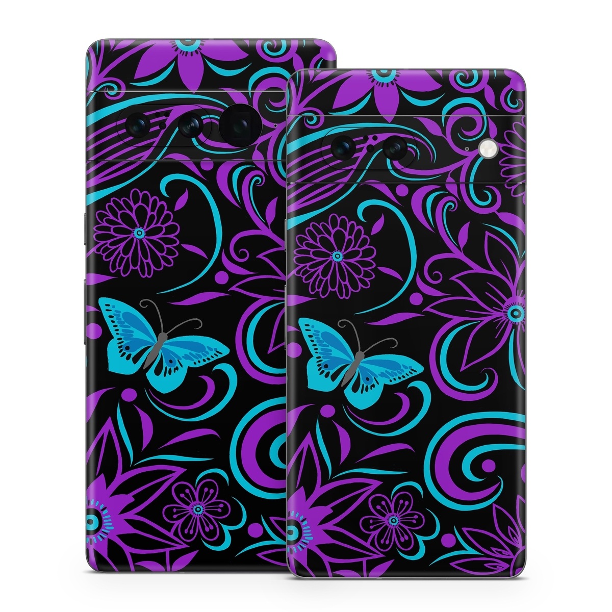 iStyles Google Pixel 7 Series Skin design of Pattern, Purple, Violet, Turquoise, Teal, Design, Floral design, Visual arts, Magenta, Motif, with black, purple, blue colors, and tagged with flowers, patterns.