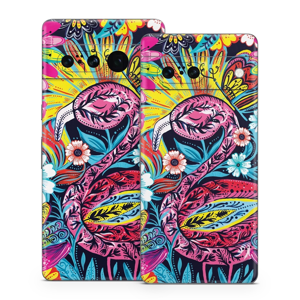 iStyles Google Pixel 7 Series Skin design of Psychedelic art, Pattern, Visual arts, Art, Design, Textile, Illustration, Plant, Graphic design, Drawing, with pink, yellow, black, blue, white colors, and tagged with animals, flowers, animals, bright, colorful, flamingo, flowers, spring, summer, tropical.