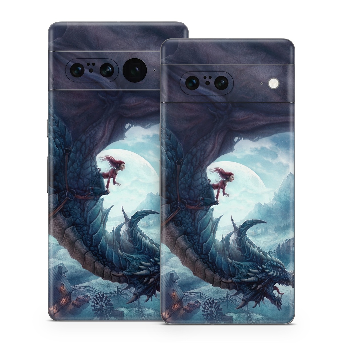 iStyles Google Pixel 7 Series Skin design of Dragon, Cg artwork, Illustration, Action-adventure game, Fictional character, Mythical creature, Mythology, Fiction, Cryptid, Extinction, with blue, white, brown, green colors, and tagged with fantasy, animals, people, nature, urban, dragon, fantasy, girl, night, woman.
