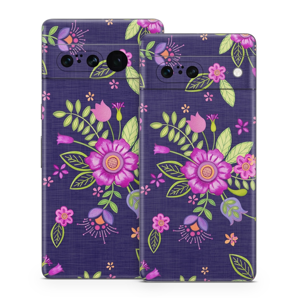 iStyles Google Pixel 7 Series Skin design of Pink, Pattern, Magenta, Purple, Violet, Floral design, Lilac, Textile, Visual arts, Pedicel, with black, gray, purple, green, blue colors, and tagged with patterns, flowers.