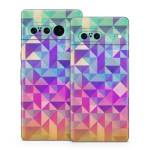 iStyles Google Pixel 7 Series Skin design of Pattern, Purple, Triangle, Violet, Magenta, Line, Design, Symmetry, Psychedelic art, with gray, purple, green, blue, pink colors, and tagged with patterns.