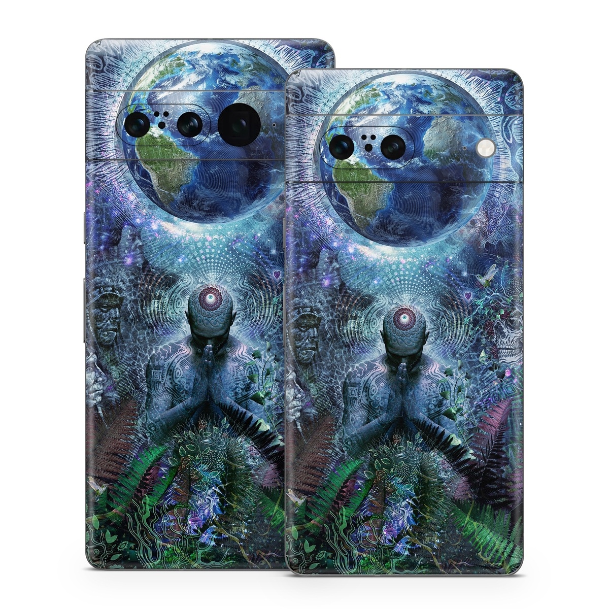 iStyles Google Pixel 7 Series Skin design of Psychedelic art, Fractal art, Art, Space, Organism, Earth, Sphere, Graphic design, Circle, Graphics, with blue, green, gray, purple, pink, black, white colors, and tagged with people, fantasy, space, signs, dmt, fantasy, gratitude, indian, jungle, love, lsd, nativeamerican, nature, peace, plants, ritual, scifi, skulls, space, spirits, spiritual, symbols, trippy, world, worldpeace.