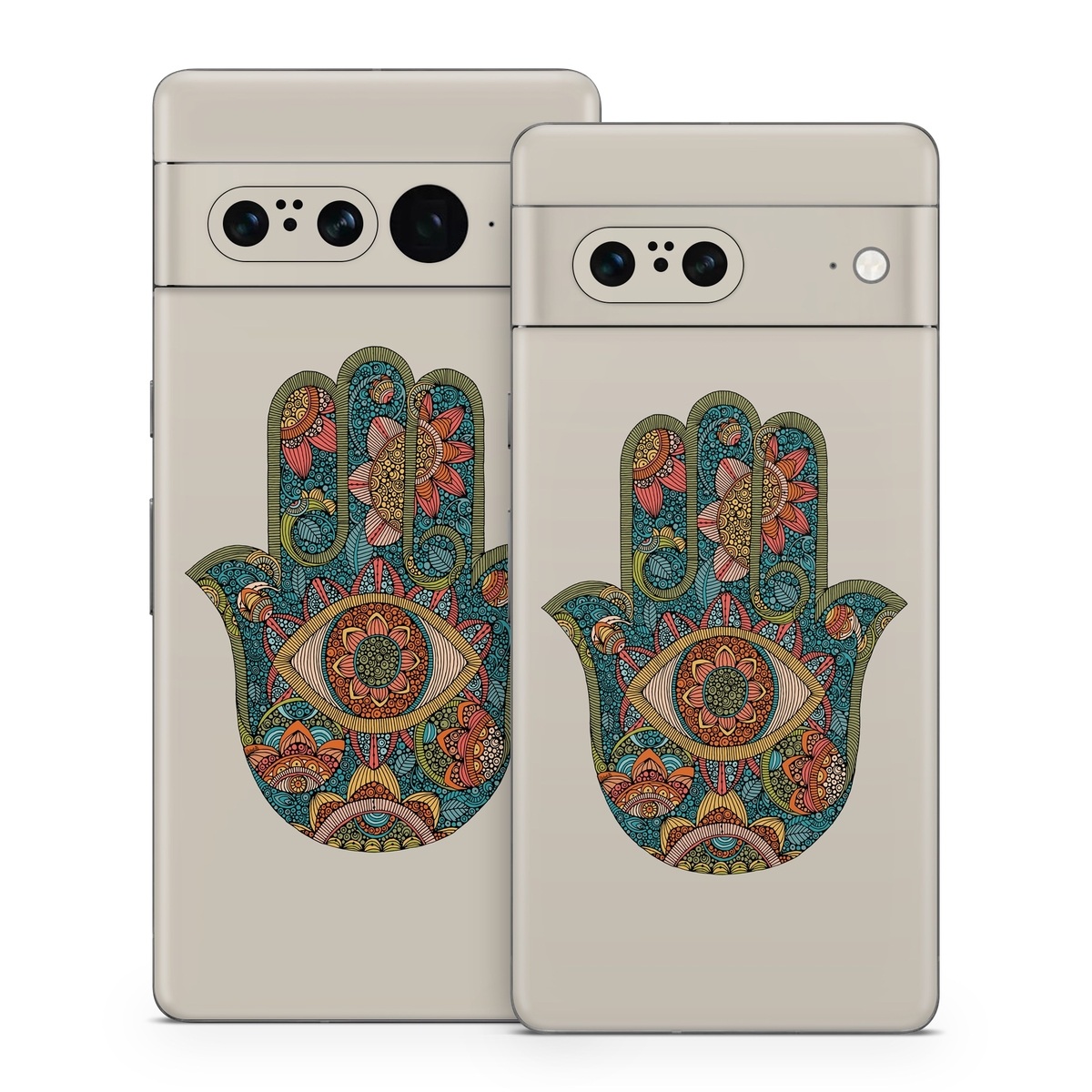 iStyles Google Pixel 7 Series Skin design of Art, Pattern, Symmetry, Circle, Font, Visual arts, Illustration, Painting, Symbol, Drawing, with blue, red, yellow, orange, green colors, and tagged with patterns, flowers, signs, people, evileye, flowers, hand, protection.