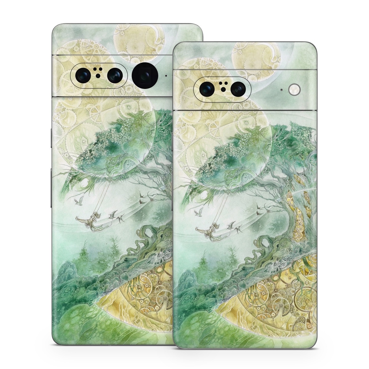 iStyles Google Pixel 7 Series Skin design of Illustration, Organism, Art, World, Fictional character, with green, yellow, brown colors, and tagged with animals, nature, people, objects, birds, gears, swing, tree.