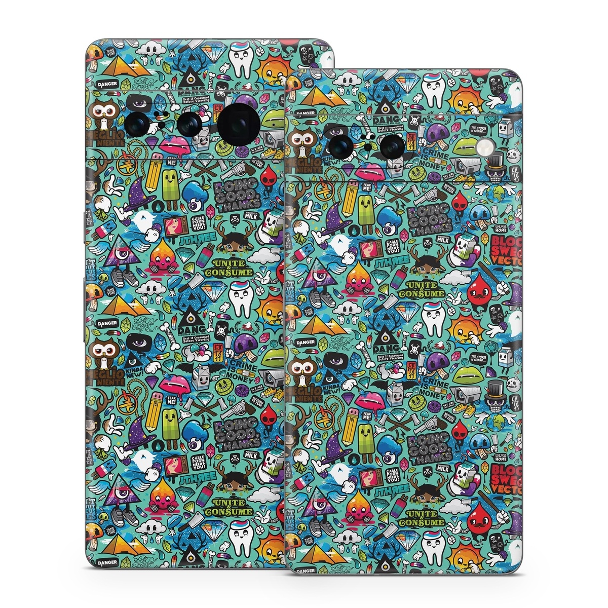 iStyles Google Pixel 7 Series Skin design of Cartoon, Art, Pattern, Design, Illustration, Visual arts, Doodle, Psychedelic art, with black, blue, gray, red, green colors, and tagged with abstract, objects.