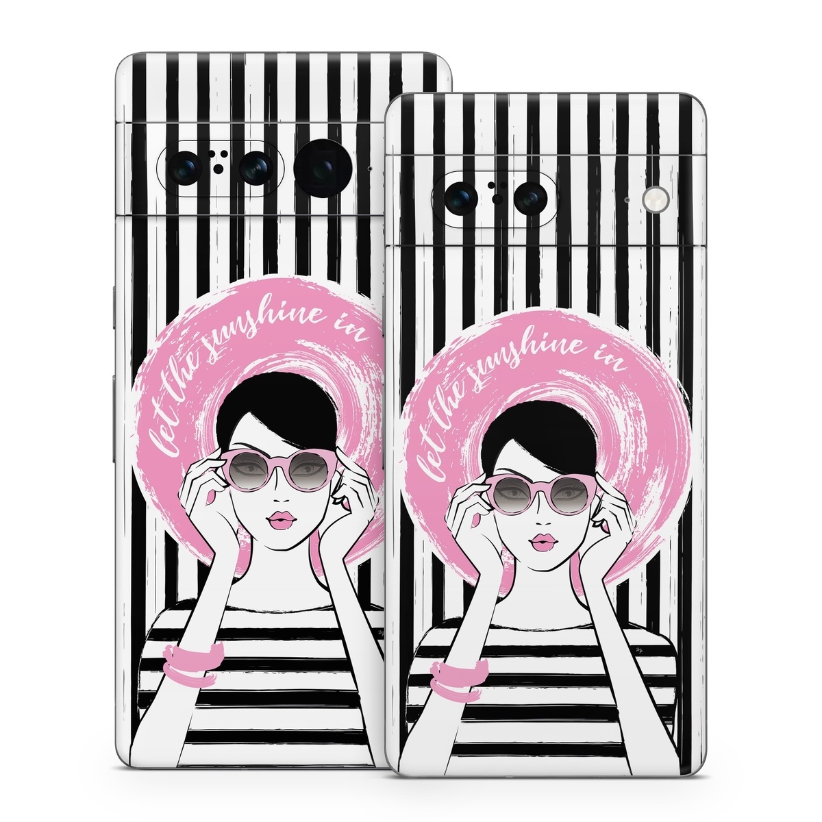 iStyles Google Pixel 7 Series Skin design of Organ, Vision care, Purple, Pink, Violet, Font, Eyewear, Magenta, Line, Art, with black, white, pink, gray colors, and tagged with signs, objects, people, patterns, blackandwhite, girl, glasses, hat, pink, stripes.