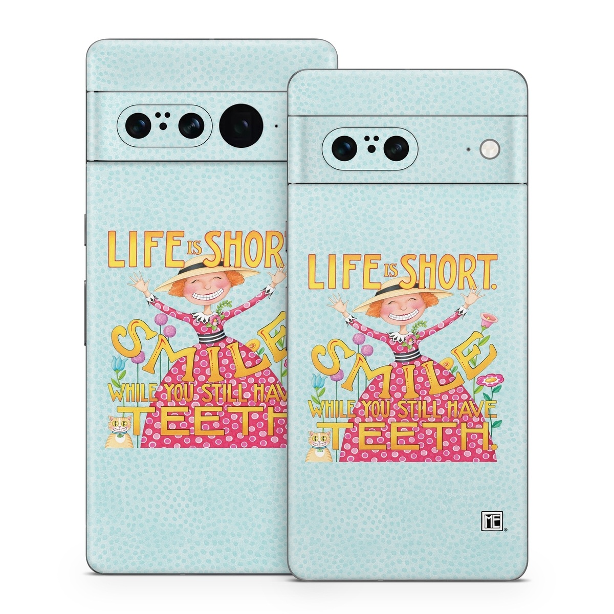 iStyles Google Pixel 7 Series Skin design of Text, Poster, Font, Illustration, Happy, Art, with blue, yellow, pink, green, orange, red, white, black colors, and tagged with signs, people, flowers, animals, cat, funny, humor.