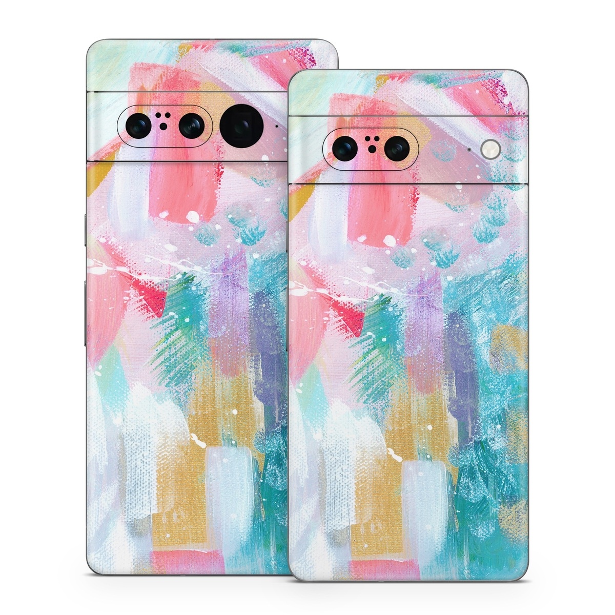 iStyles Google Pixel 7 Series Skin design of Colorfulness, Art paint, Paint, Pink, Creative arts, Art, Aqua, Magenta, Tints and shades, Font, with white, blue, pink, purple, green, yellow colors, and tagged with abstract, absrtact, brush, brushstrokes, gold, paint, painting, pastel, splatter, stamps.