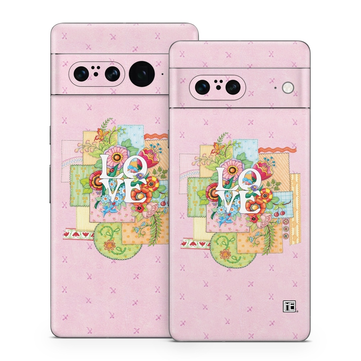 iStyles Google Pixel 7 Series Skin design of Illustration, Graphics, Art, with pink, blue, white, orange, yellow, green, red colors, and tagged with signs, flowers, animals, flower, flowers, love, patch, patches, pattern, sew, sewing, stitch, stitches, stitching.