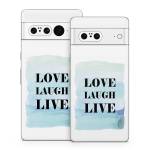 iStyles Google Pixel 7 Series Skin design of Rectangle, Sleeve, Font, Linens, Pillow, Electric blue, Logo, Bedding, Facial hair, Brand, with white, black, blue, purple, green colors, and tagged with signs, blue, laugh, live, love.