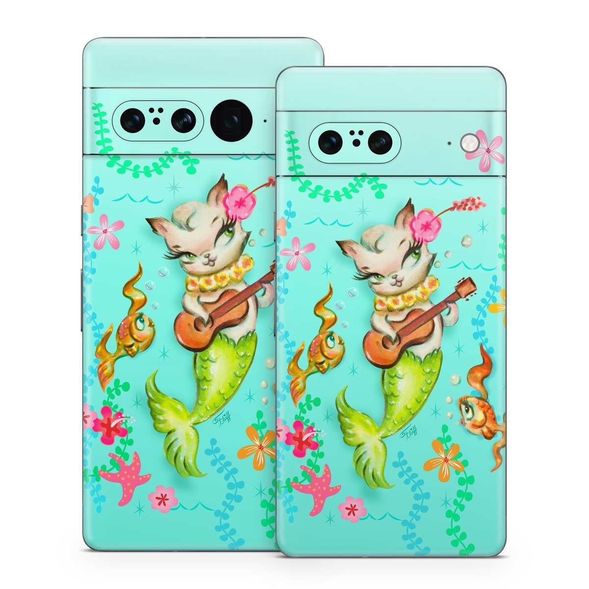 iStyles Google Pixel 7 Series Skin design of Fictional character, Illustration, Mermaid, Mythical creature, Clip art, Art, with blue, green, pink, yellow, orange, white, gray, brown colors, and tagged with fantasy, animals, flowers, nature, objects, animal, animals, beach, cat, floral, flowers, kitten, mermaid, music, ocean, pastel, pinup, pinupgirl, pinupstyle, sealife.