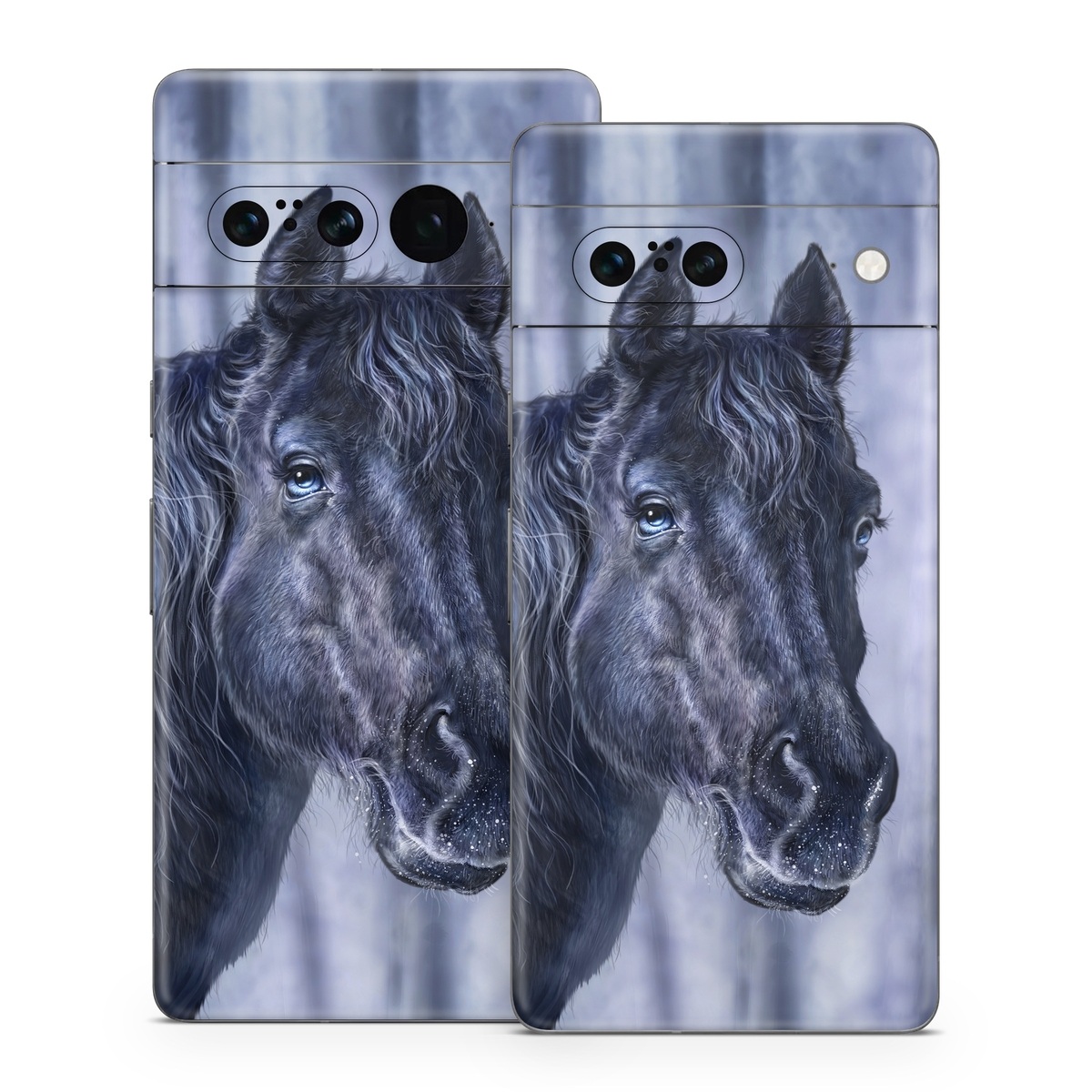 iStyles Google Pixel 7 Series Skin design of Horse, Mammal, Vertebrate, Hair, Mane, Stallion, Snout, Mare, Mustang horse, Livestock, with black, white, blue colors, and tagged with fineart, animals, animal, animals, black, blue, farm, horse, mare, outdoors, stallion.