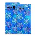iStyles Google Pixel 7 Series Skin design of Blue, Pattern, Organism, Design, Sea turtle, Plant, Electric blue, Hydrangea, Flower, Symmetry, with blue, green, purple colors, and tagged with patterns, animals, flower, nature, sealife, turtle, turtles, watercolor.