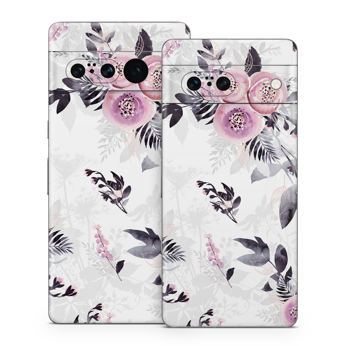 iStyles Google Pixel 7 Series Skin design of Pink, Pattern, Design, Floral design, Textile, Plant, Flower, Magenta, Petal, Wallpaper, with white, purple, pink, black, gray colors, and tagged with patterns, flowers, florals, flowers, pattern, purple, watercolor, white.