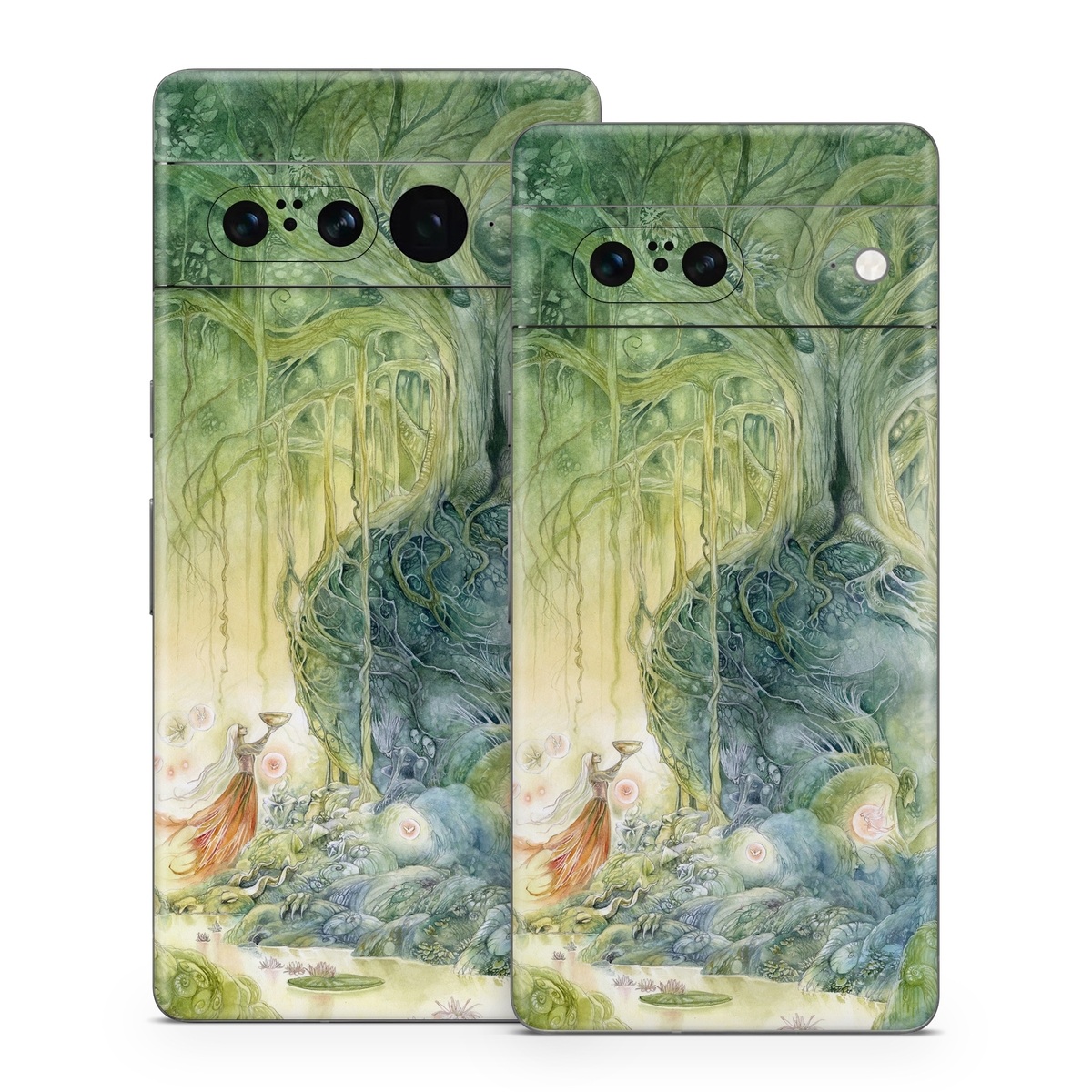 iStyles Google Pixel 7 Series Skin design of Green, Watercolor paint, Painting, Water, Art, Illustration, Grass, Tree, Plant, Fictional character, with blue, green, red, yellow colors, and tagged with people, nature, fantasy, flowers, fairies, fantasy, landscape, sci-fi, tree.
