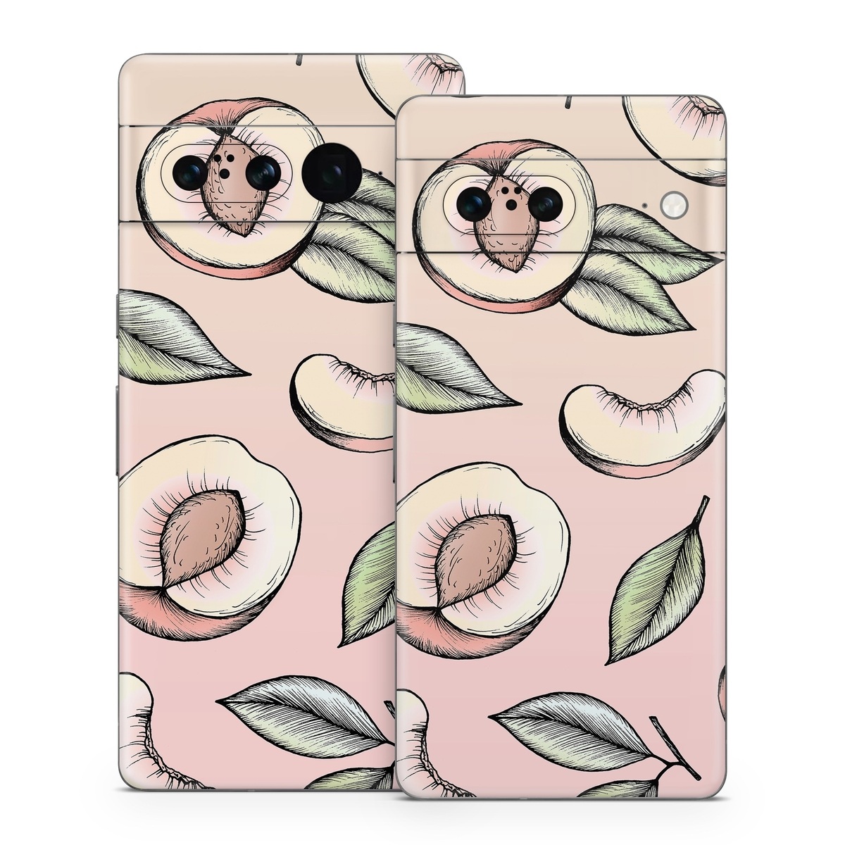 iStyles Google Pixel 7 Series Skin design of Pattern, Leaf, Botany, Organism, Design, Plant, Illustration, Clip art, with pink, green, yellow, orange colors, and tagged with objects, patterns, fruit, leaf, leaves, nature, outdoors, pastel, peach, peaches, sketch.