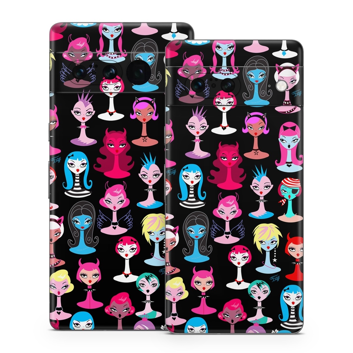iStyles Google Pixel 7 Series Skin design of Facial expression, Product, Font, Pink, Red, Magenta, Material property, Pattern, Fictional character, Illustration, with black, pink, blue, brown, red, green, white, yellow colors, and tagged with people, patterns, objects, flowers, dark, emo, girl, girls, goth, gothic, halloween, pinupgirl, punk, punkrock, rockandroll, spooky.