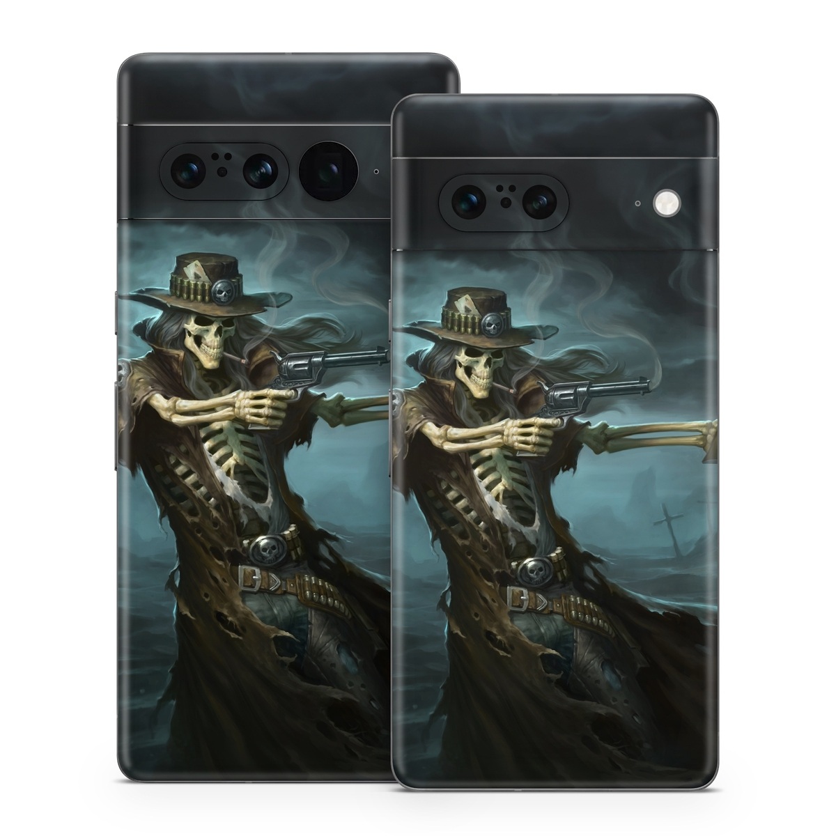 iStyles Google Pixel 7 Series Skin design of Cg artwork, Action-adventure game, Darkness, Illustration, Games, Adventure game, Pc game, Woman warrior, Digital compositing, Fictional character, with black, white, blue, gray colors, and tagged with fantasy, skulls, people, bullets, fantasy, gaming, guns, skeleton, skull.