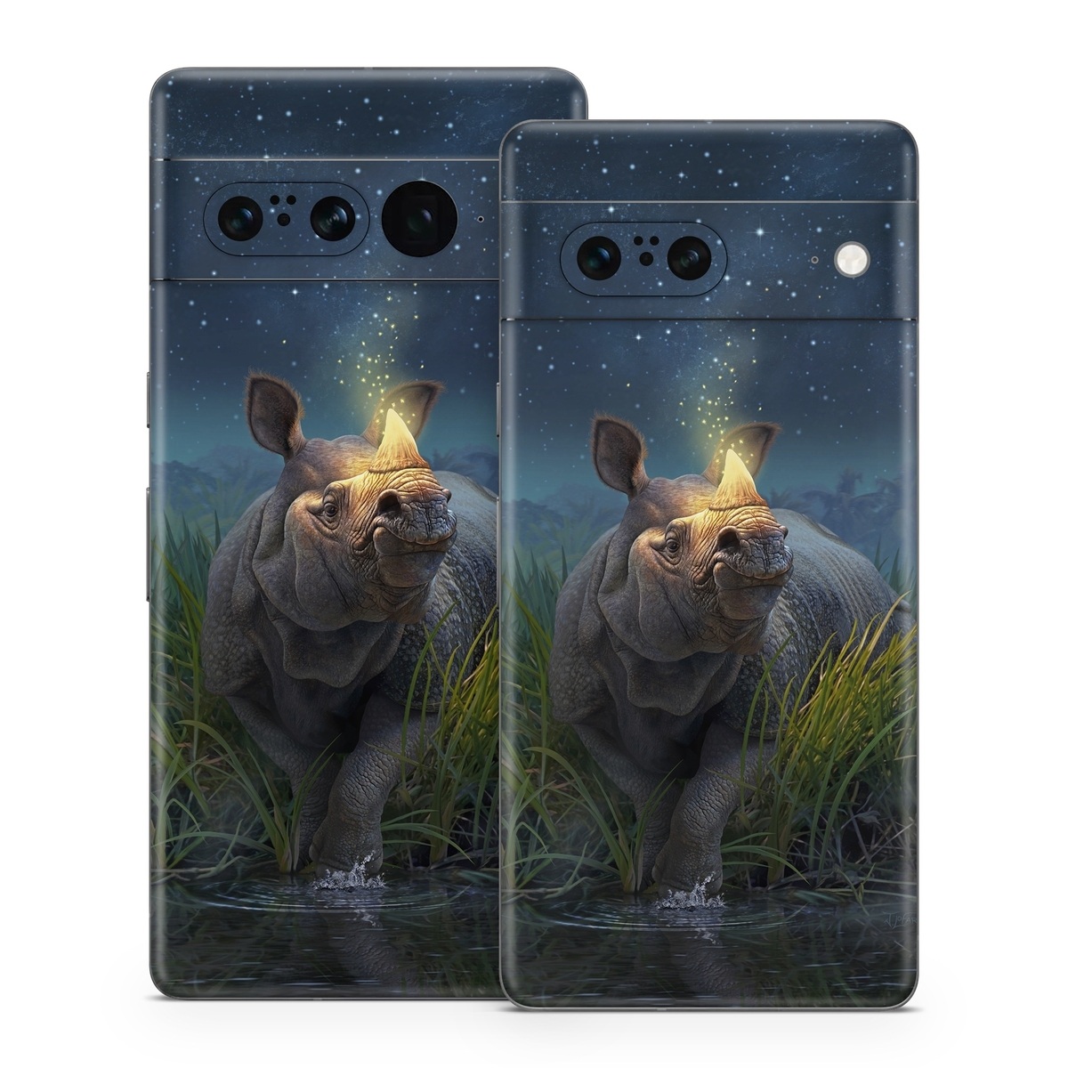 iStyles Google Pixel 7 Series Skin design of Wildlife, Sky, Photography, Grass, Fawn, with blue, green, gray, yellow, white colors, and tagged with animals, nature, animals, fantasy, rhino, sci-fi.