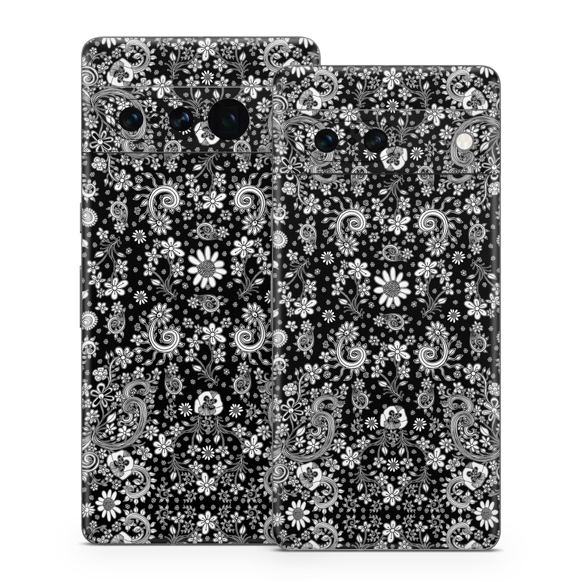 iStyles Google Pixel 7 Series Skin design of Pattern, Monochrome, Design, Black-and-white, Visual arts, Textile, Motif, Monochrome photography, Symmetry, with black, white colors, and tagged with patterns, flowers, blackandwhite, doodles, florals, flowers, sketches.