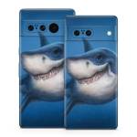 iStyles Google Pixel 7 Series Skin design of Fish, Great white shark, Shark, Tiger shark, Cartilaginous fish, Requiem shark, Lamniformes, Bull shark, Carcharhiniformes, with black, blue, gray colors, and tagged with animals, animals, ocean, sealife, shark, wildlife.