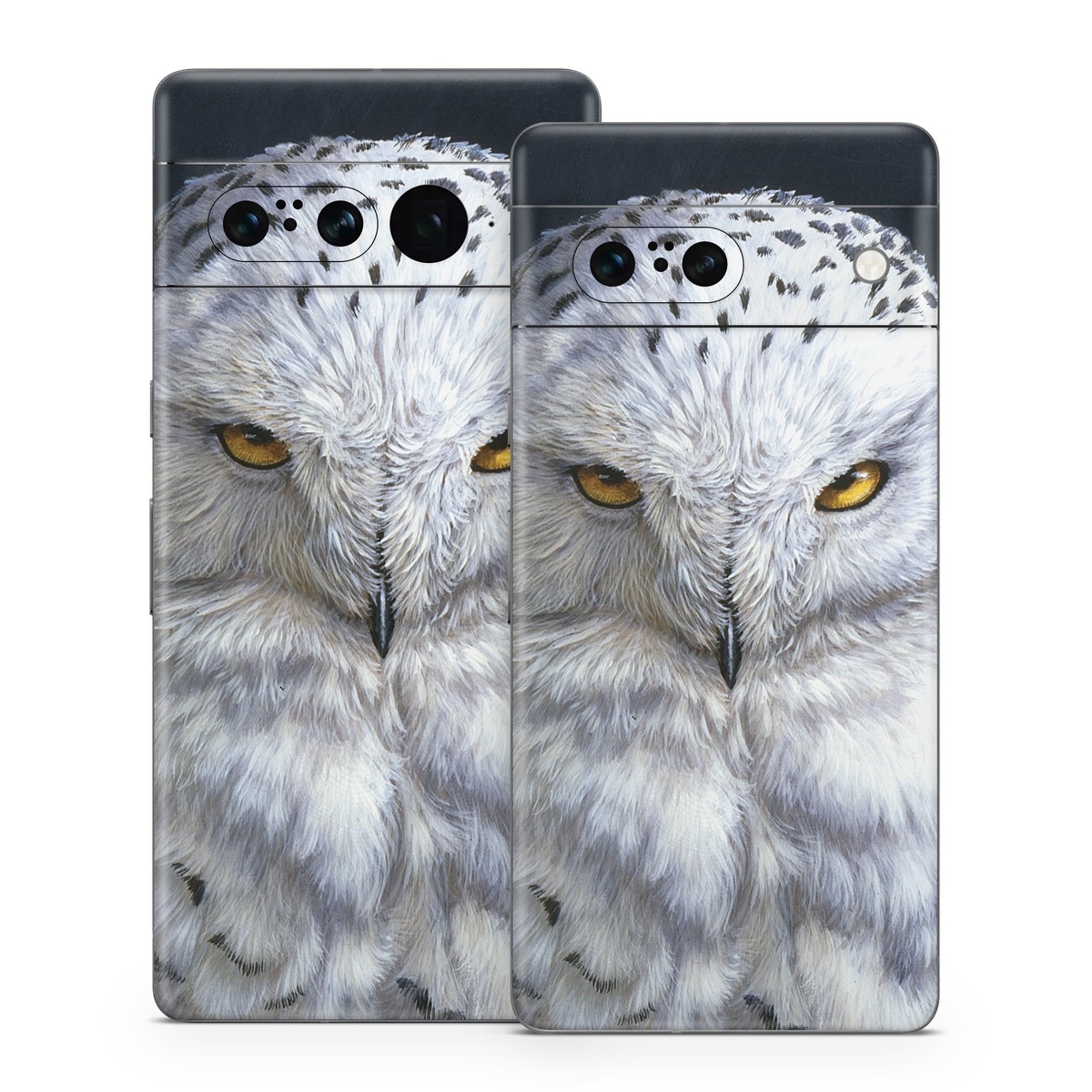 iStyles Google Pixel 7 Series Skin design of Owl, Bird, Bird of prey, Snowy owl, great grey owl, Close-up, Eye, Snout, Wildlife, Eastern Screech owl, with gray, white, black, blue, purple colors, and tagged with animals.