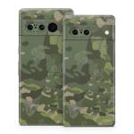 iStyles Google Pixel 7 Series Skin design of Military camouflage, Pattern, Camouflage, Uniform, Clothing, Green, Design, Leaf, Plant, Illustration, with green, brown colors, and tagged with military, skulls, patterns, athlete, fitness, gym, skull, skulls, spade.
