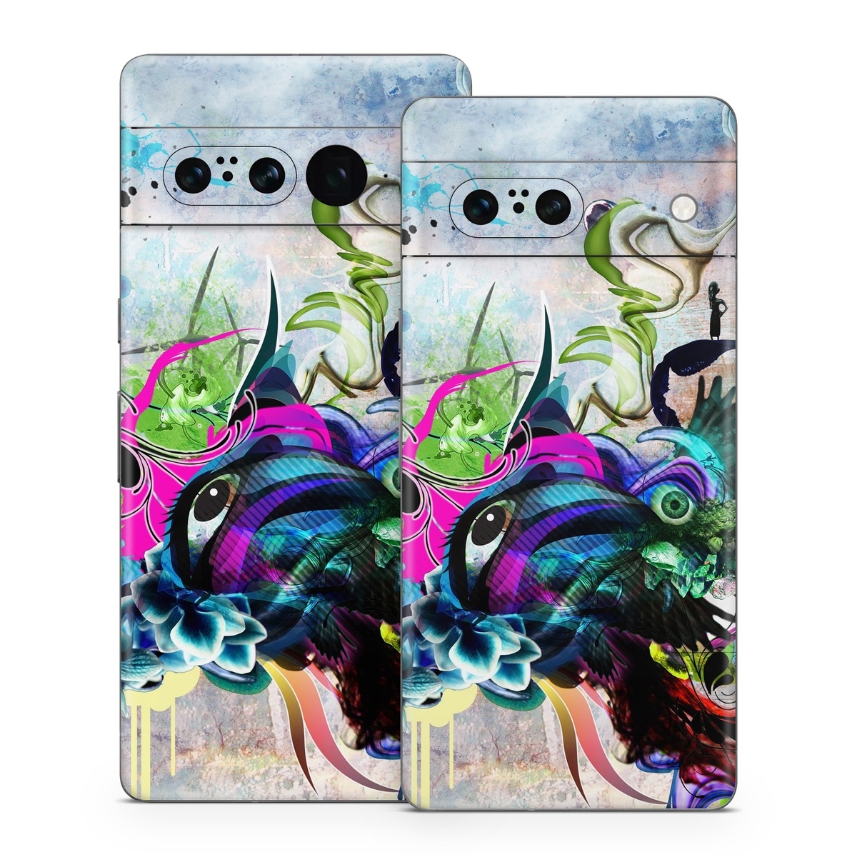 iStyles Google Pixel 7 Series Skin design of Graphic design, Psychedelic art, Art, Illustration, Purple, Visual arts, Graffiti, Street art, Design, Painting, with gray, black, blue, green, purple colors, and tagged with abstract, animals, flowers.