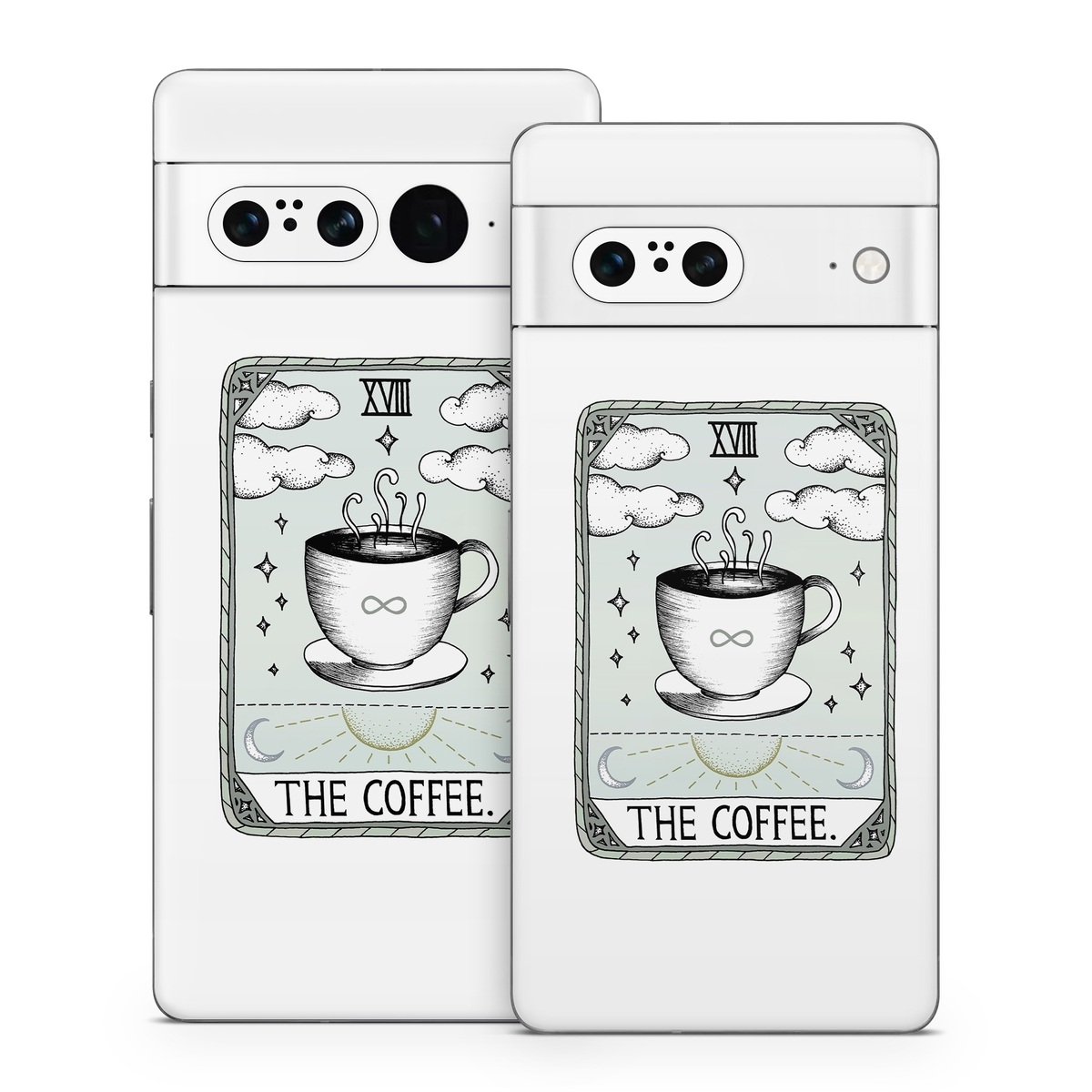 iStyles Google Pixel 7 Series Skin design of Cup, Cartoon, Drinkware, Coffee cup, Tableware, Teacup, Illustration, Drink, Line art, with white, black, green, gray, yellow colors, and tagged with objects, signs, space, coffee, handdrawn, pastel, sketch, tarot.