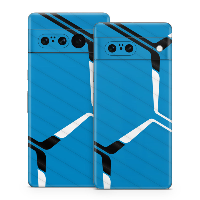 iStyles Google Pixel 7 Series Skin design of Azure, Triangle, Parallel, Font, Electric blue, Pattern, Symmetry, Table, Symbol, Logo, with blue, black, white colors, and tagged with patterns, hexagon, pattern, lines.