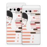 iStyles Google Pixel 7 Series Skin design of Eyebrow, Gesture, Font, Carmine, Graphics, Thumb, Art, Illustration, Graphic design, Lipstick, with white, black, pink, brown, red colors, and tagged with objects, people, patterns, reading, girl, spectacles.